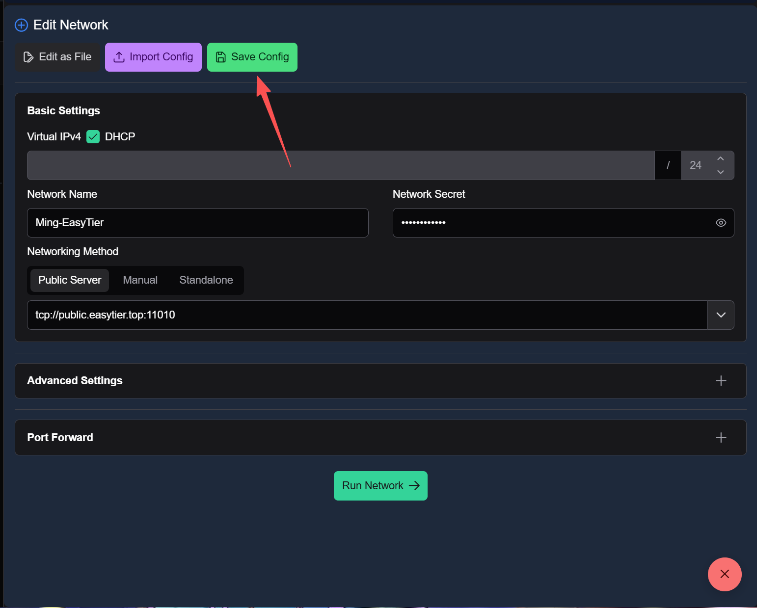 设置完成后点击上方的 Save Config(图中点错了,应该是先点 Run Network)